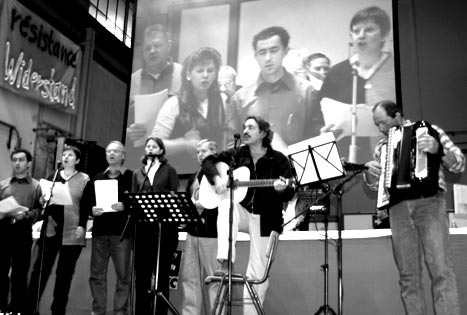2004 - Halle 7. Betriebsversammlung bei Alstom-Mannheim. Der kleine Alstomchor. Rechts am Akkordeon: Helmut Hoffmann // Foto: Willi Hölzel